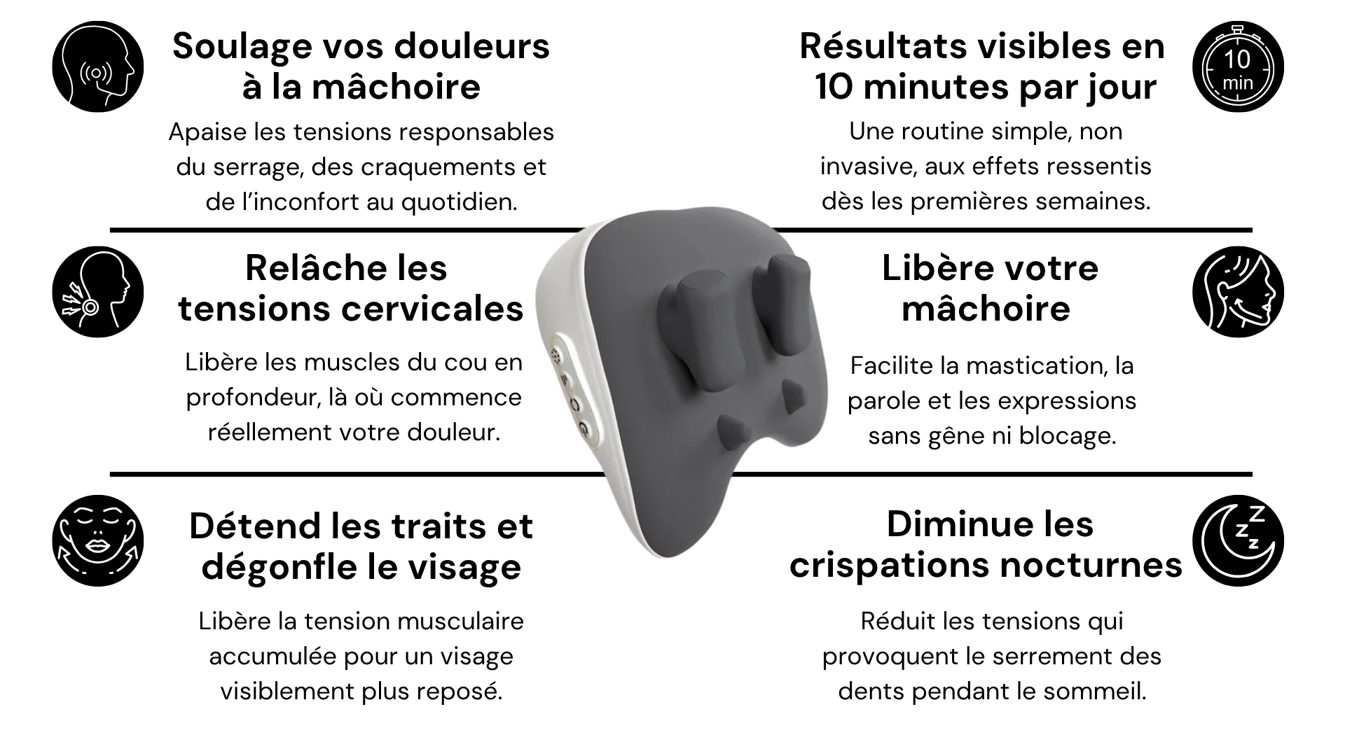 Son rôle : relâcher la tension musculaire qui tire sur votre mâchoire, détendre la base du crâne, et apaiser durablement les douleurs.