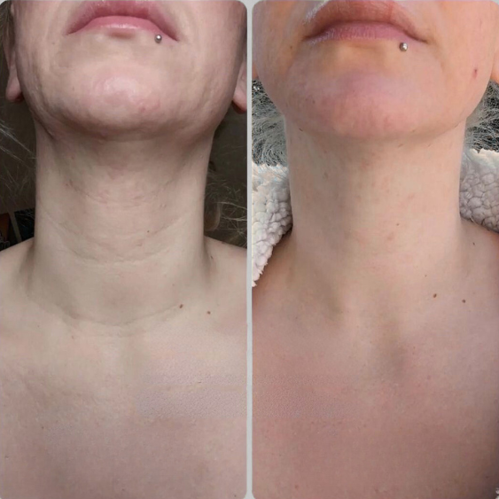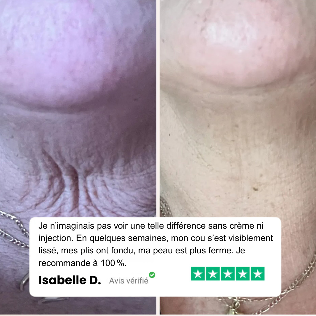 En vieillissant, j’ai vu mon cou changer plus vite que le reste de mon visage. Ce dispositif m’a bluffée. Je sens une vraie amélioration au niveau de la fermeté, et je vois mes plis s’adoucir semaine après semaine. Très satisfaite.