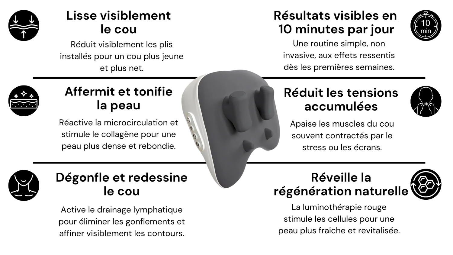 Design premium, simple à nettoyer. Je sens clairement une amélioration sur la tonicité de mon cou, que même les soins en institut n’avaient pas apportée.