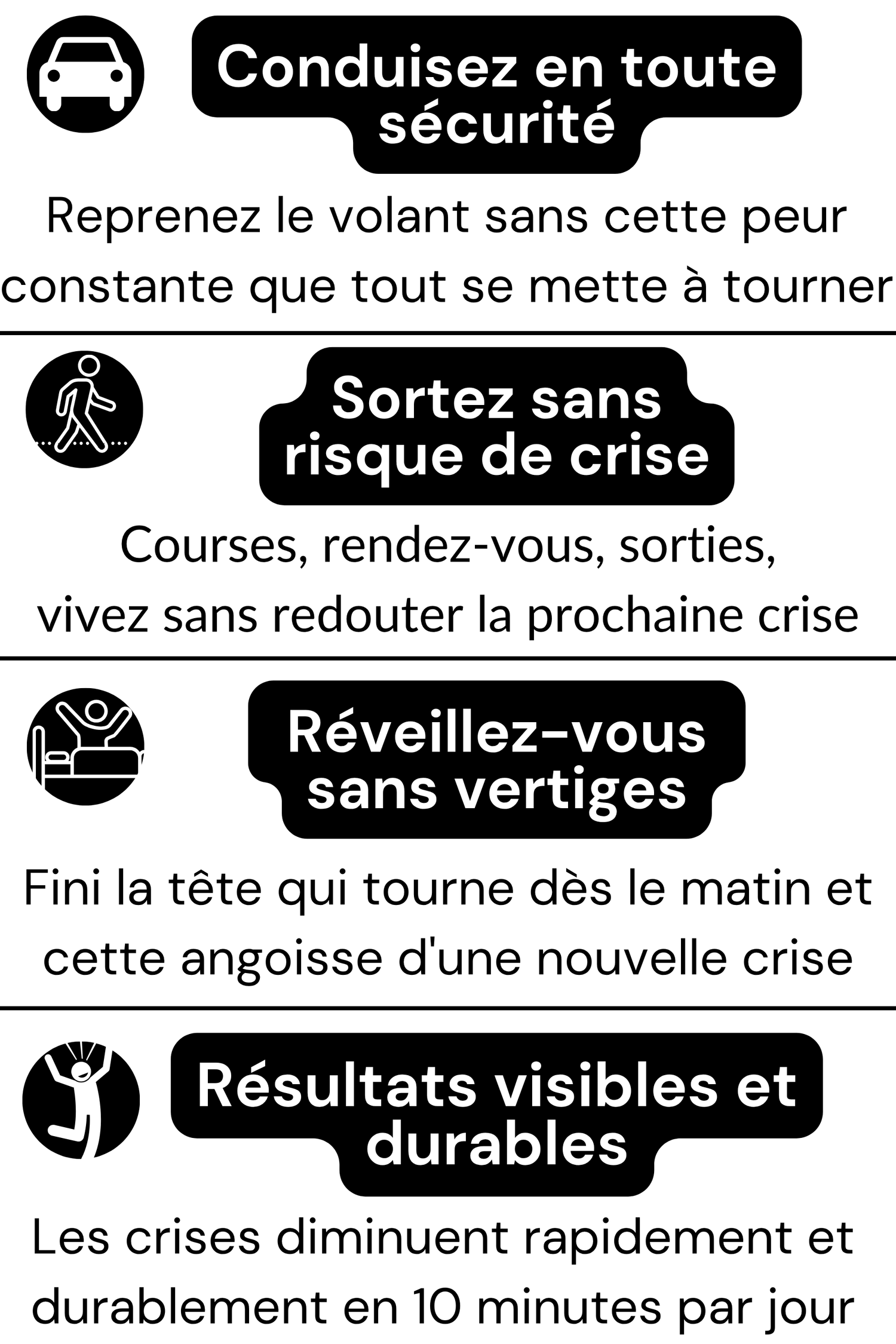 Après des années de galère avec des vertiges que personne n'arrivait à expliquer, j'ai enfin trouvé LA solution. Les crises qui me prenaient en pleine journée ont complètement cessé. Je revis normalement, je peux travailler, voir mes amis, conduire sans cette angoisse permanente.
