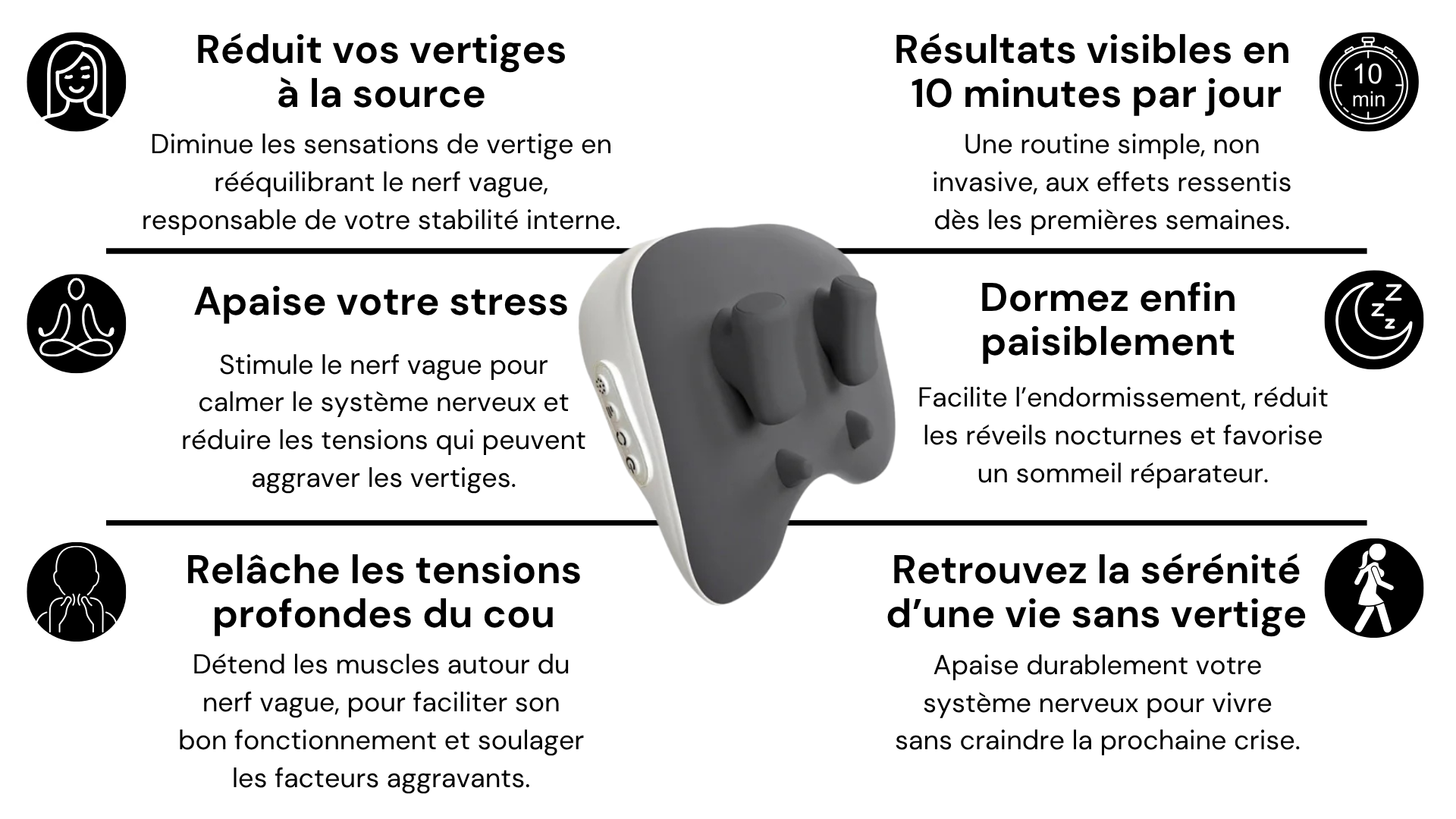 Cervalya Vagalis est un dispositif de décompression cervicale conçu pour les personnes souffrant de vertiges liés aux tensions du cou. Il agit sur la véritable cause du problème : les muscles profonds du haut du dos et de la nuque qui compriment le nerf vague, pour soulager les crises, les étourdissements et l'instabilité ressentie au quotidien.