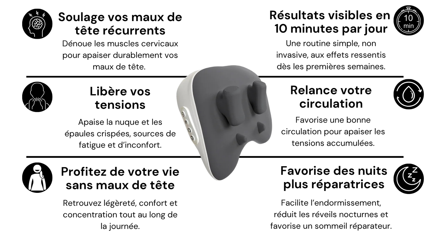 Son rôle : libérer les muscles crispés qui déclenchent vos maux de tête, détendre la nuque et les épaules, et apaiser durablement les tensions.